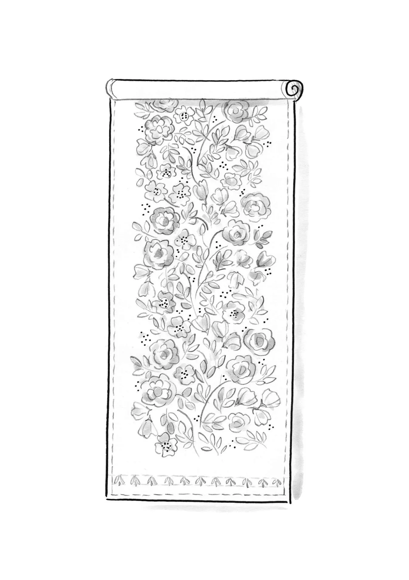 Schöner Tischläufer mit dem Dessin „Wild rose“ und dekorativen Bordüren an den Schmalseiten. Siebdruck auf einem Gewebe aus Leinen und Bio-Baumwolle.