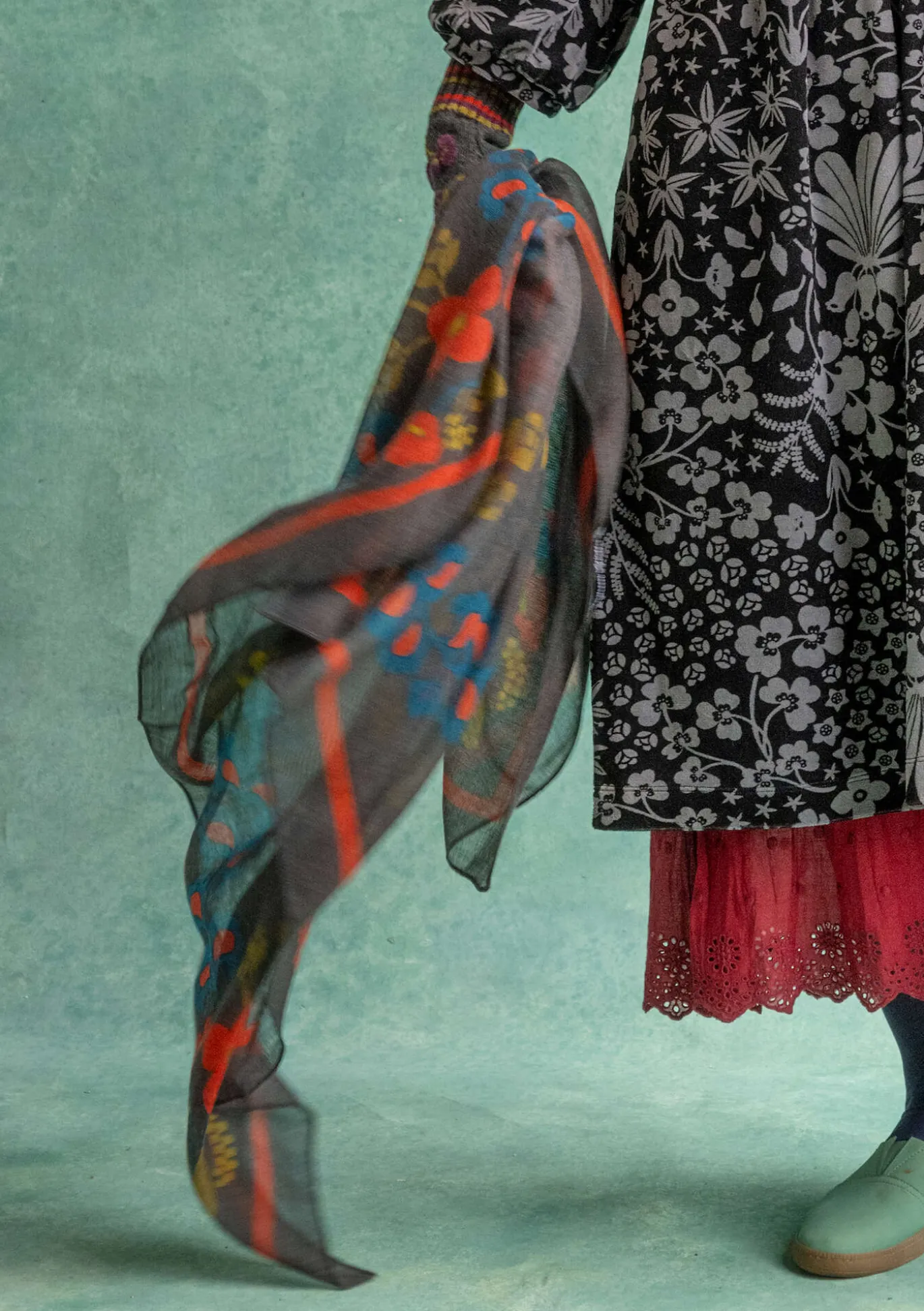 Schönes quadratisches Tuch aus wärmender Wolle. Üppig gemustert mit hübschem Aufdruck und umrahmender Bordüre.