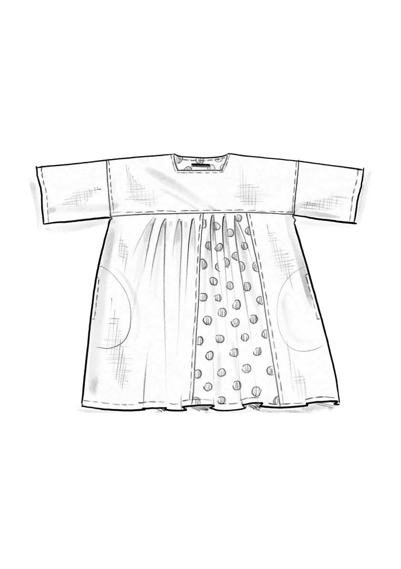 Tunika mit Teilungsnaht, oben aus einer kräftigeren Qualität gearbeitet. Herrlich weites Modell mit Kräuselungen vorne und hinten. Eckiger Ausschnitt mit kleinem Knopf. Kontrastierender Print auf einer Vorderpartie sowie innen im Nacken. Leicht verkürzte 3/4-Ärmel.