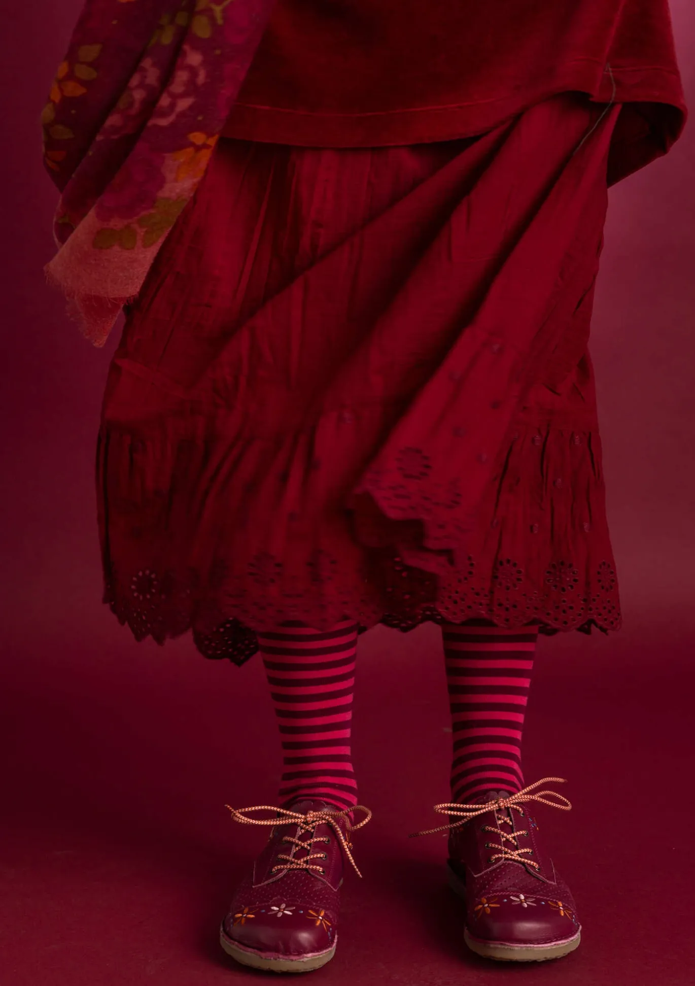 Schlichtes Modell mit Dehnbund. Bordüre mit Lochstickereien und Stickpunkten am Saum. Bund per Knopf verstellbar, für eine optimale Passform.