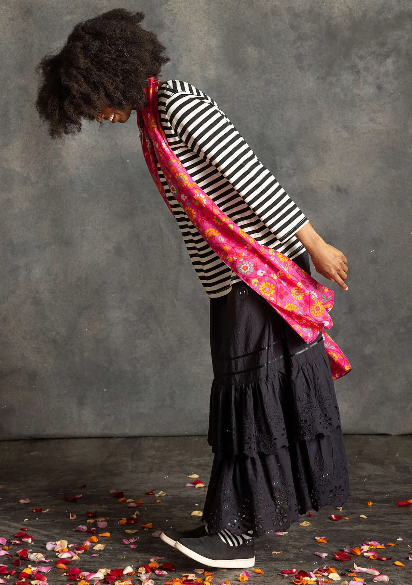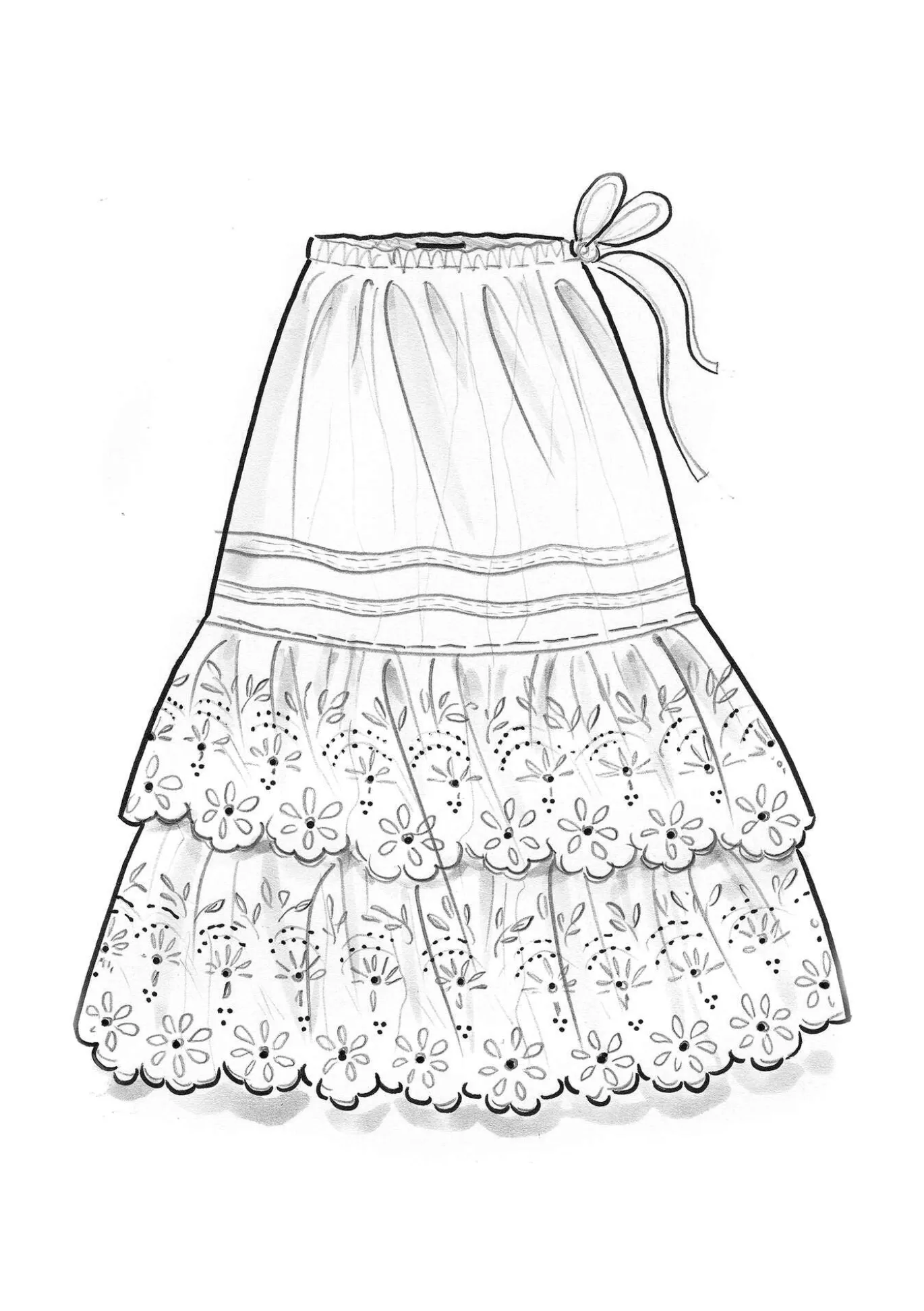 Verzierter Rock, schön entweder solo oder als Unterrock zu tragen. Modell mit zwei überlappend gearbeiteten Stufen mit Lochstickerei. Zwei aufgenähte Satinbandstreifen oberhalb der Stufen. Dehnbund mit Tunnelzug.