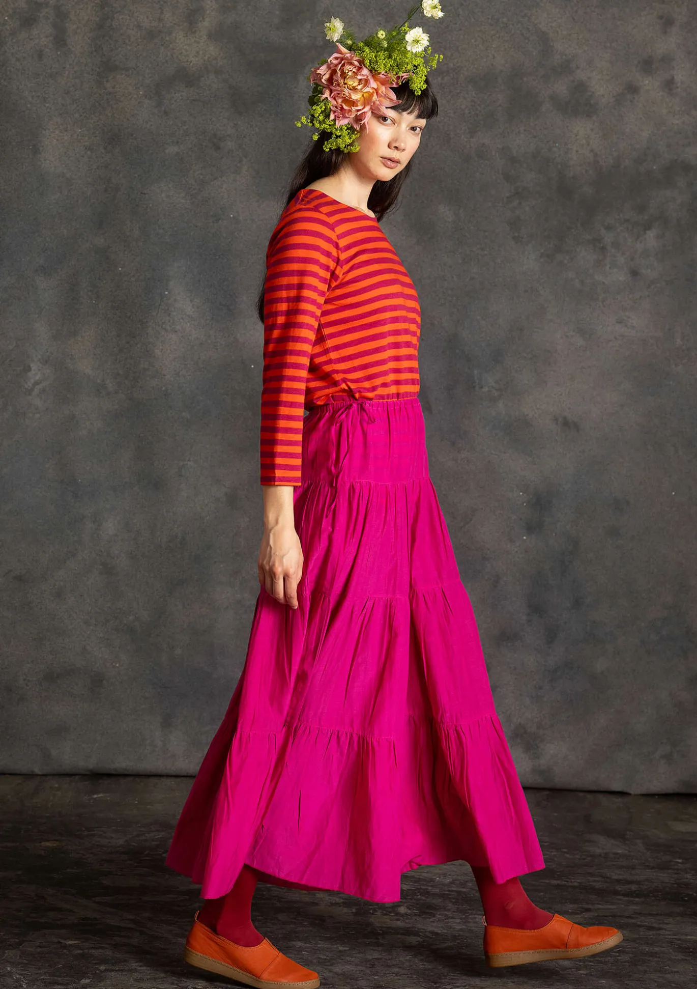 Weiter Rock aus einem herrlichen Baumwolle/Seide-Gewebe mit schönem Fall. Hübsches Modell mit vier Stufen und Tunnelzug im bequemen Dehnbund.