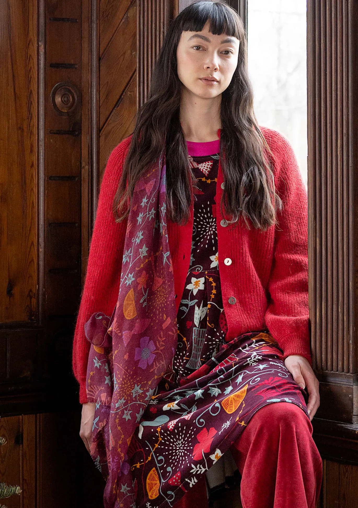 Wollschal mit prächtigem Musterprint. Mit kontrastierendem Garn gesäumte Längsseiten. Ungesäumte Schmalseiten mit kurzen, natürlichen Fransen.
