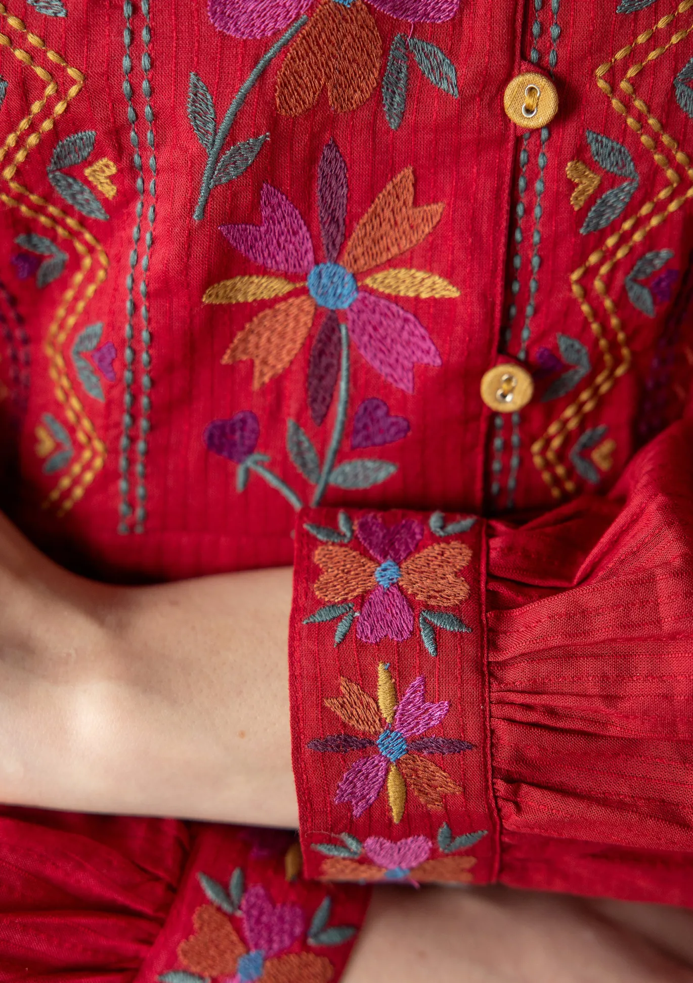 Webtunika mit hübschen Stickereien an Vorderteil, Manschetten und Saum. Langarmmodell mit angekräuselter Passe vorne. Runder Ausschnitt mit Bandeinfassung in Akzentfarbe. Kontrastierende Stoffknöpfe an Ärmelabschlüssen und Passe.