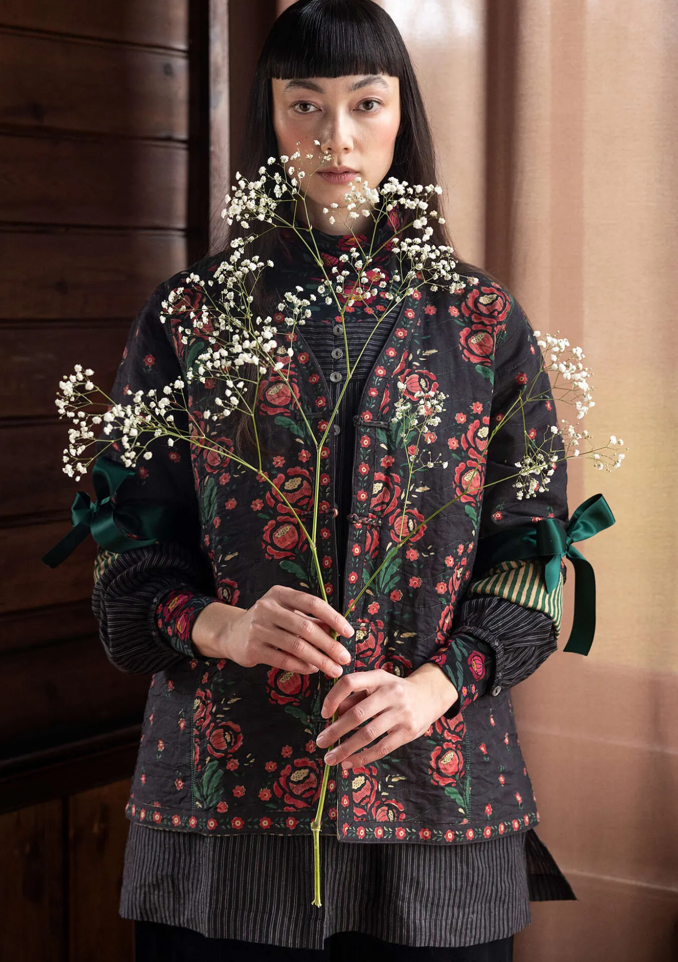 Gerade geschnittene Wendejacke mit Blockdruck und langen Ärmeln. Gestepptes Modell mit einer leichten Schicht aus Baumwollflanell. Seitentaschen und eine aufgesetzte Tasche. Aufwendig mit einer Stickblüte auf dem Rücken gearbeitet. Ganz klassisch mit Stoffknöpfen im China-Stil zu schließen.