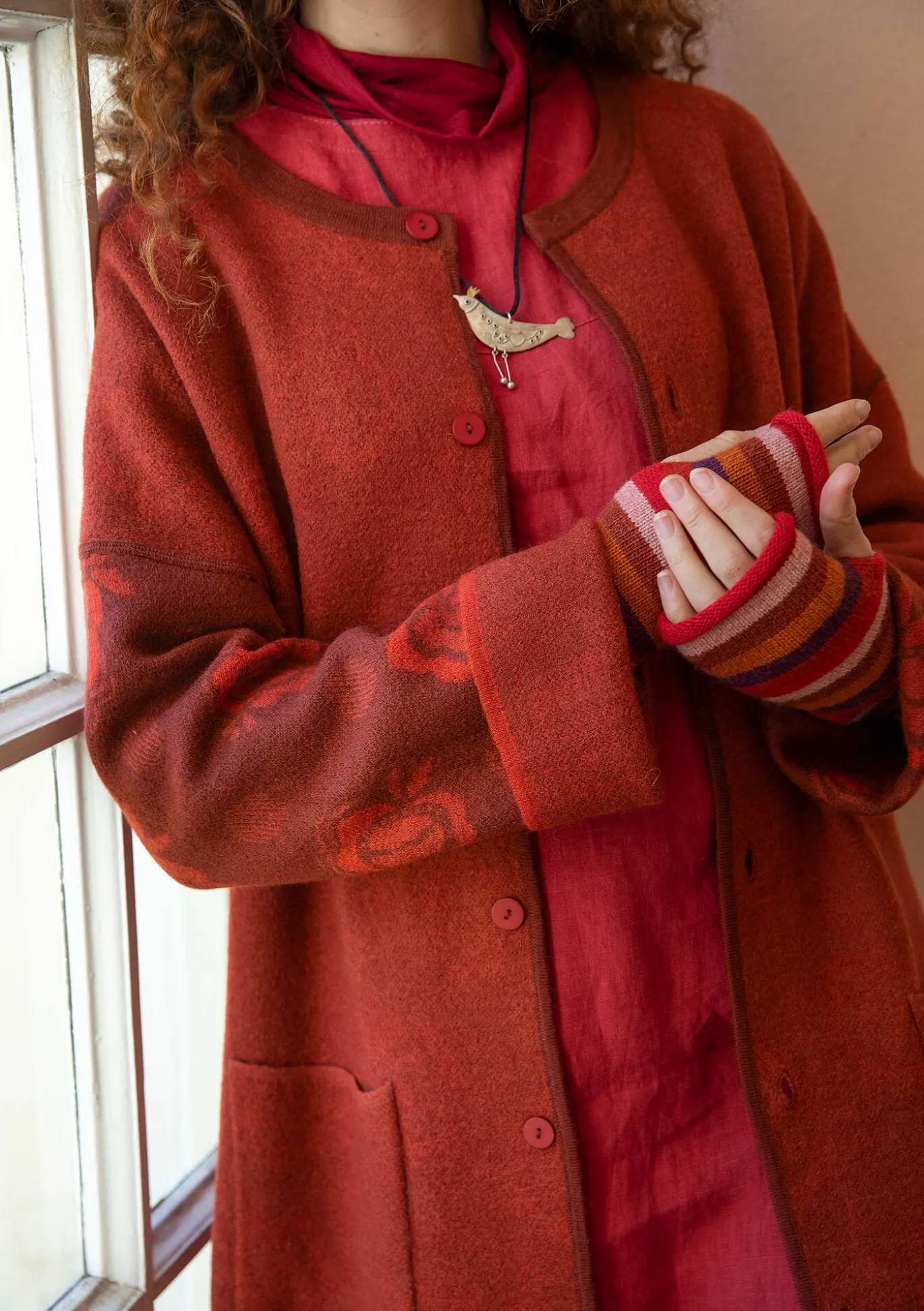 Wendbarer Jacquardstrickmantel aus gefilzter Bio-Wolle. Eine Seite mit Rosenmuster, die andere einfarbig mit Melangeeffekt. Ein Ärmel mit umgekehrten Seiten. Modell mit überschnittenen Schultern und rundem Ausschnitt. Zwei aufgesetzte Taschen auf jeder Mantelseite.
