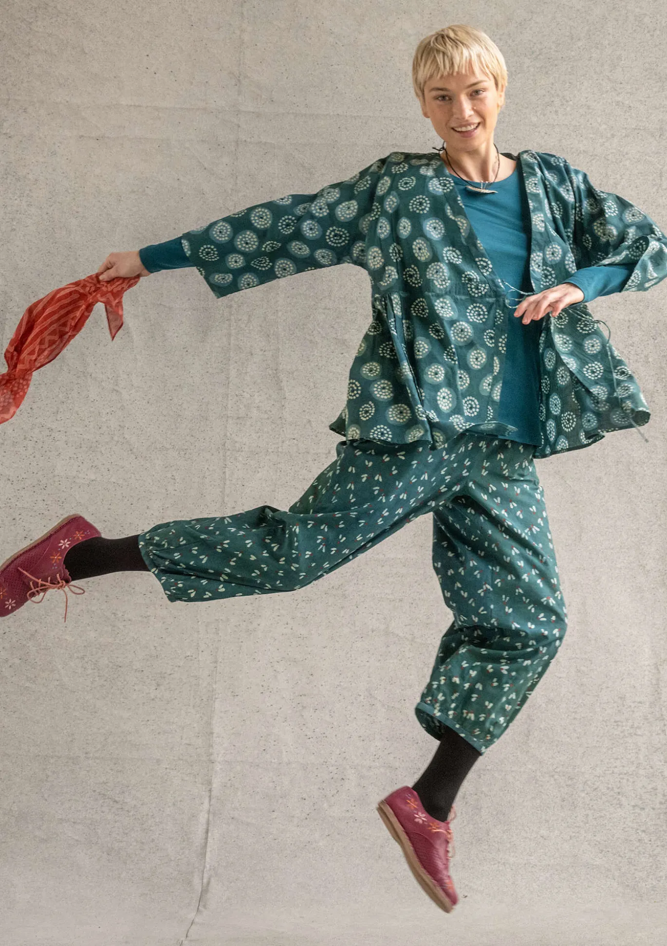 Überlappend gearbeitete Bluse mit 3/4-Ärmeln, überschnittenen Schultern, seitlichen Bindebändern und Seitentaschen. Auf handwerkliche Art gefertigte Bluse, mithilfe von Lehm-Reservage blockbedruckt und mit verschiedenen Pflanzenpigmenten gefärbt. Schöne Verarbeitung mit garnumwickelten Enden an den Bindebändern.